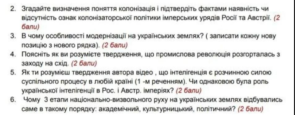 ПОМОГИТЕ ПОЖАЛУЙСТА 2. Згадайте визначення поняття колонiзацiя i пiдтвердiть фактами наявність чи відсутність ознак колонізаторської політики імперських урядів Росії та Австрії. (2 бали) 3. В чому особливості модернізації на українських землях? ( записати кожну нову позицію з нового рядка). (2 бали) 4. Поясніть як ви розумієте твердження, що промислова революція розгорталась з заходу на схід. (2 бали) 5. Як ти розумієш твердження автора відео, що інтелігенція є розчинною силою суспільного процесу в любій країні (1 -м реченням). Чи однаковою була роль української інтелігенції в Рос. і Австр. iмперіях? (2 бали) 6. Чому 3 етапи національно-визвольного руху на українських землях відбувались саме в такому порядку: академічний, культурницький, політичний? (2 бали)