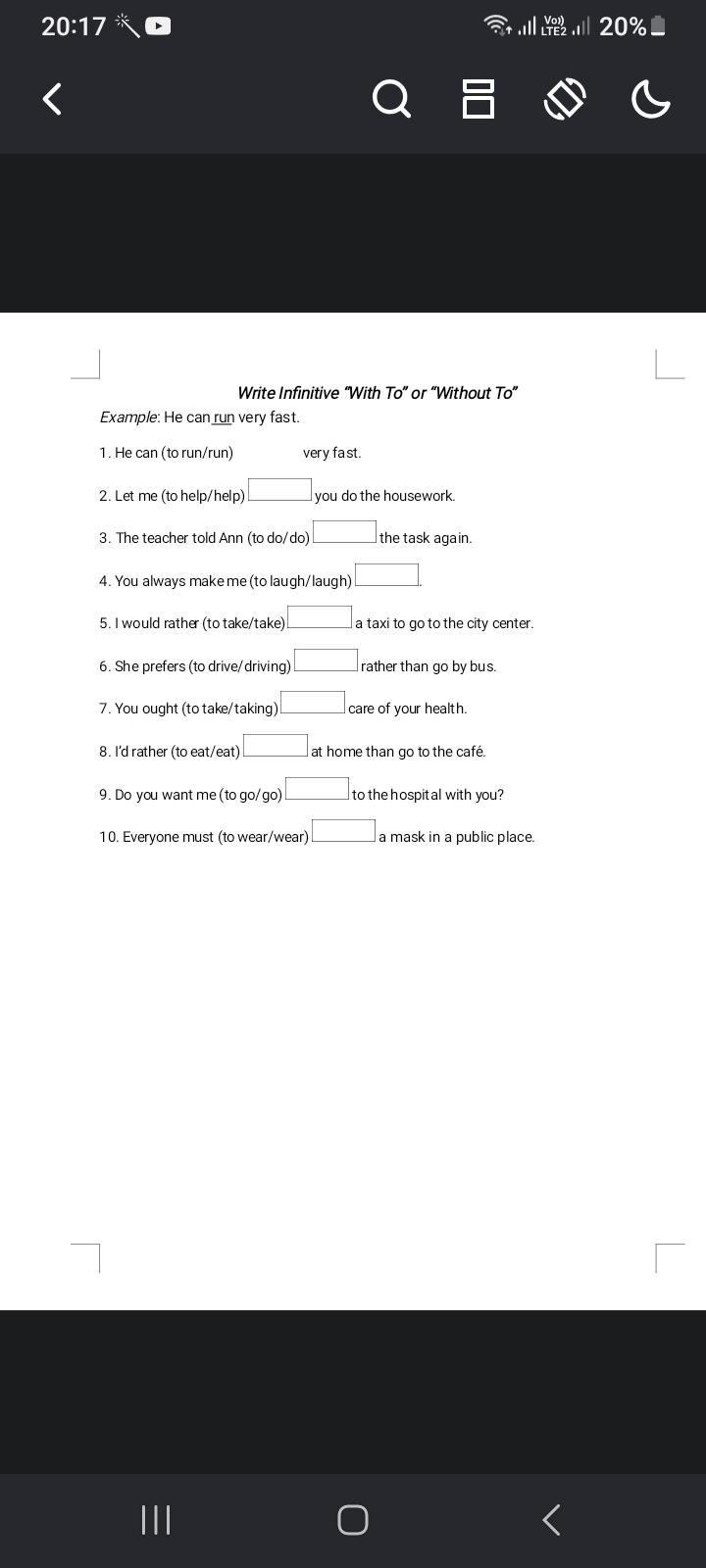 2 help. 3 to do. 4 laugh. 5 driving. 6 to take. 7 to eat. 8 to go. 9 wear.