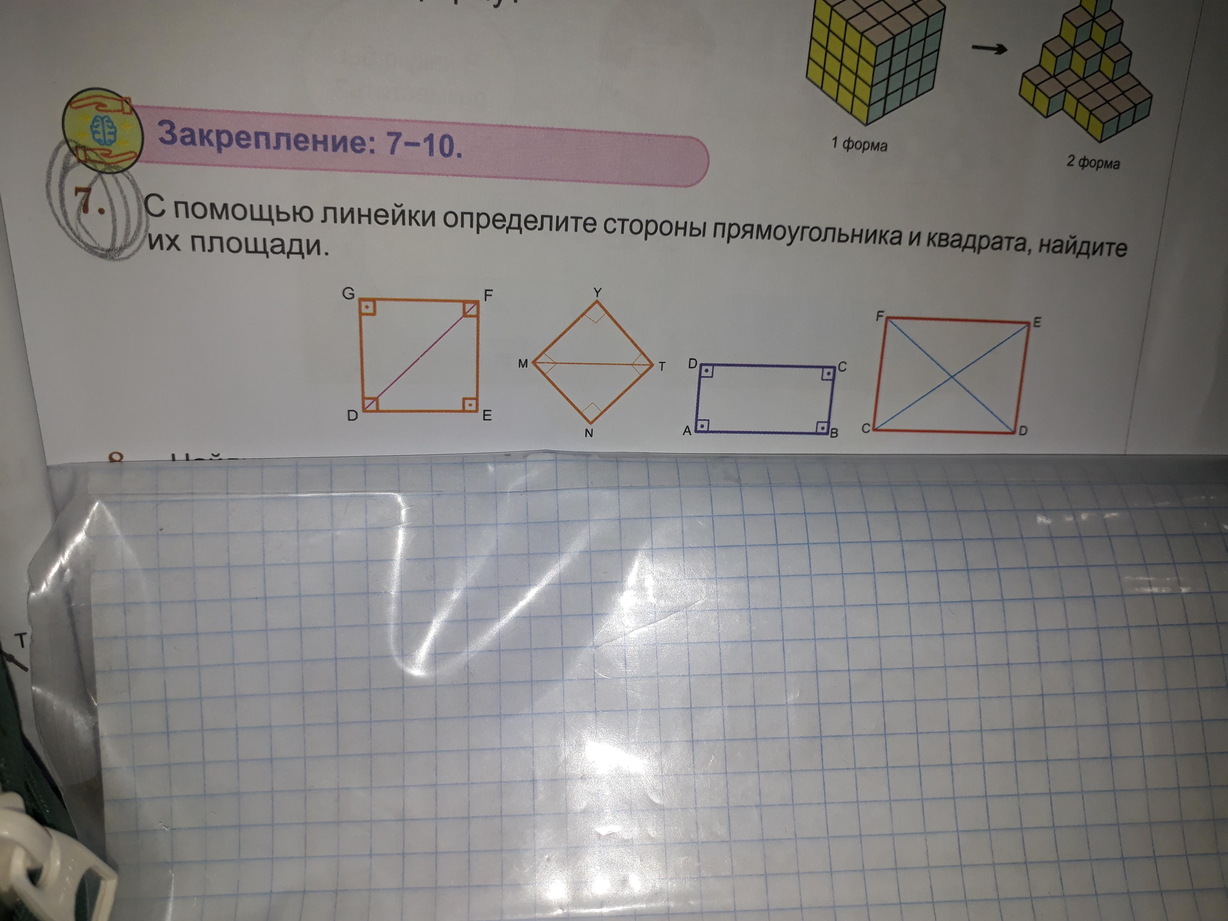 С помощью линейки определите стороны прямоугольника и квадрата,найдите их площади