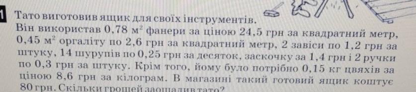 371 Тато вигоТОВИВ ЯЩИК ДЛя своїх інструментів. Він використав 0,78 м2 фанери за ціною 24,5 грн за квадратний метр, 0,45 м2 оргаліту по 2,6 грн за квадратний метр, 2 завіси по 1,2 грн за штуку, 14 шурупів по 0,25 грн за десяток, заскочку за 1,4 грн і 2 ручки по 0,3 грн за штуку. Крім того, йому було потрібно 0,15 кг цвяхів за ціною 8,6 грн за кілограм. В магазині такий готовий ящик коштує 80 грн. Скільки грошей заощадив тато,