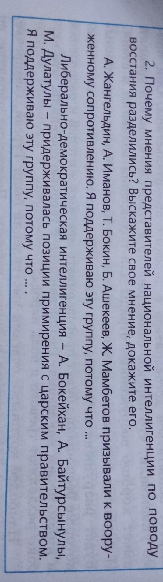 2. Почему мнения представителей национальной интеллигенции по поводу восстания разделились? Выскажите свое мнение, докажите его. А. Жангельдин, А. Иманов, Т. Бокин, Б. Ашекеев, Ж. Мамбетов призывали к воору- женному сопротивлению. Я поддерживаю эту группу, потому что ... Либерально-демократическая интеллигенция А. Бокейхан, А. Байтурсынулы, М.Дулатулы - придерживалась позиции примирения с царским правительством. Я поддерживаю эту группу, потому что ....