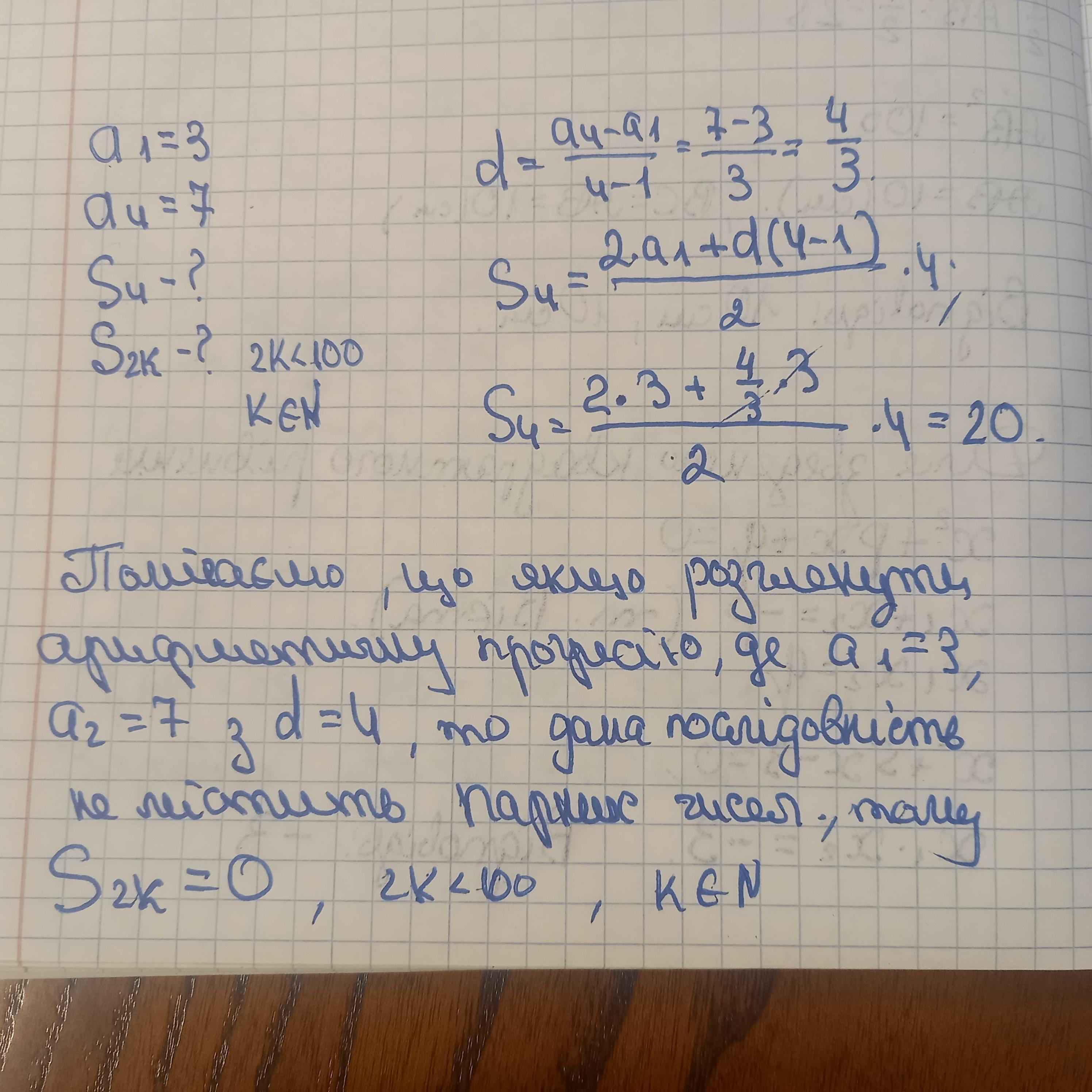 Перший і четвертий члени арифметичної прогресії відповідно дорівнюють 3 і 7. Знайдіть суму перших чотирьох членів цієї прогресії. Знайдіть суму парних натуральних чисел, не більших від 100.