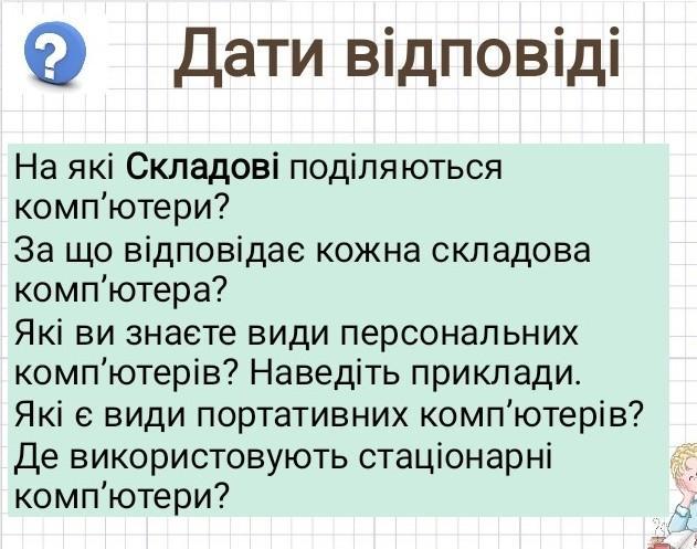 Ответ:1) Складові: корпус, оперативна пам'ять, материнська плата, клавіатура, тачпад(якщо ноутбук), плазма, основна пам'ять, процессор.