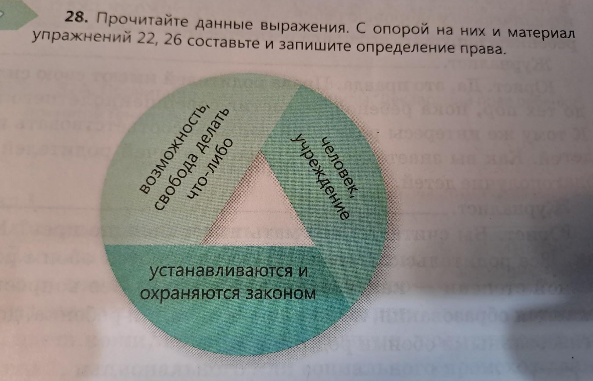 28. Прочитайте данные выражения. С опорой на них и материал упражнений 22, 26 составьте и запишите определение права. возможность, свобода делать что-либо учреждение человек, устанавливаются и охраняются законом срочно пж