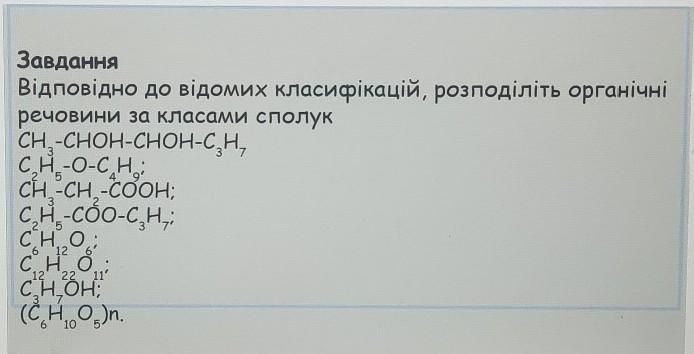 Відповідно до відомих класифікацій, розподіліть органічні речовини за класами сполук