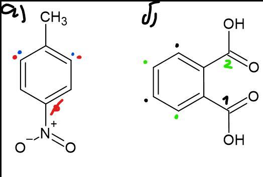 б) Карбоксильная группа ориентант первого рода, значит замещение будет в мета положение. Если смотреть относительно первой группы, то замещение будет такое (черный цвет), а если относительно второй группы, то такое (зеленый цвет). Если эту молкулу перевернуть, то будет то же самое, то есть тут нет разницы, куда встанет сульфогруппа, всегда будет один и тот же продукт.