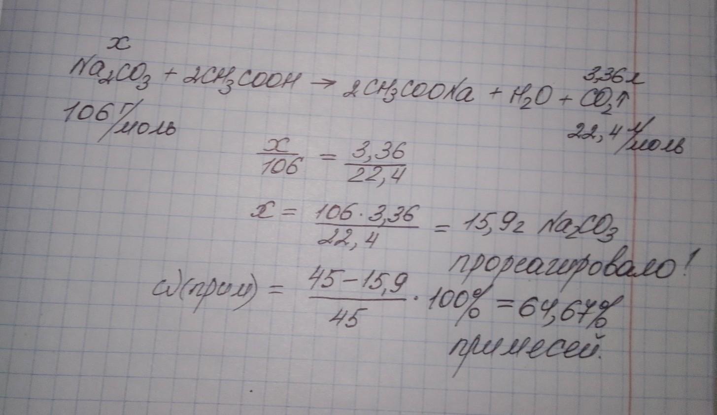2. До технічного зразку соди Na2CO3 масою 45г долили оцтову кислоту. Обчисліть масову частку домішок в соді, якщо в ході реакції виділилось 3,36л вуглекислого газу. Na₂CO3 + 2CH3COOH → 2CH3COONa + H2O + CO2
