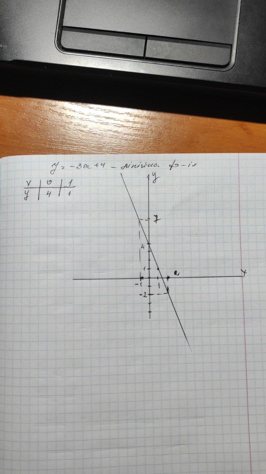 Побудувати графік функції y=-3х+4. Користуючись графіком знайти у, якщо x=-1. Знайти х, коли у=-2.