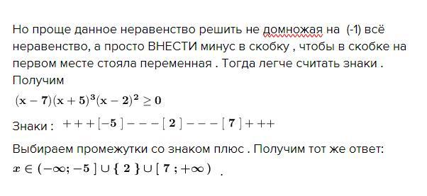 Но проще данное неравенство решить не домножая на (-1) всё неравенство, а просто ВНЕСТИ минус в скобку , чтобы в скобке на первом месте стояла переменная х . Тогда легче считать знаки . Получим