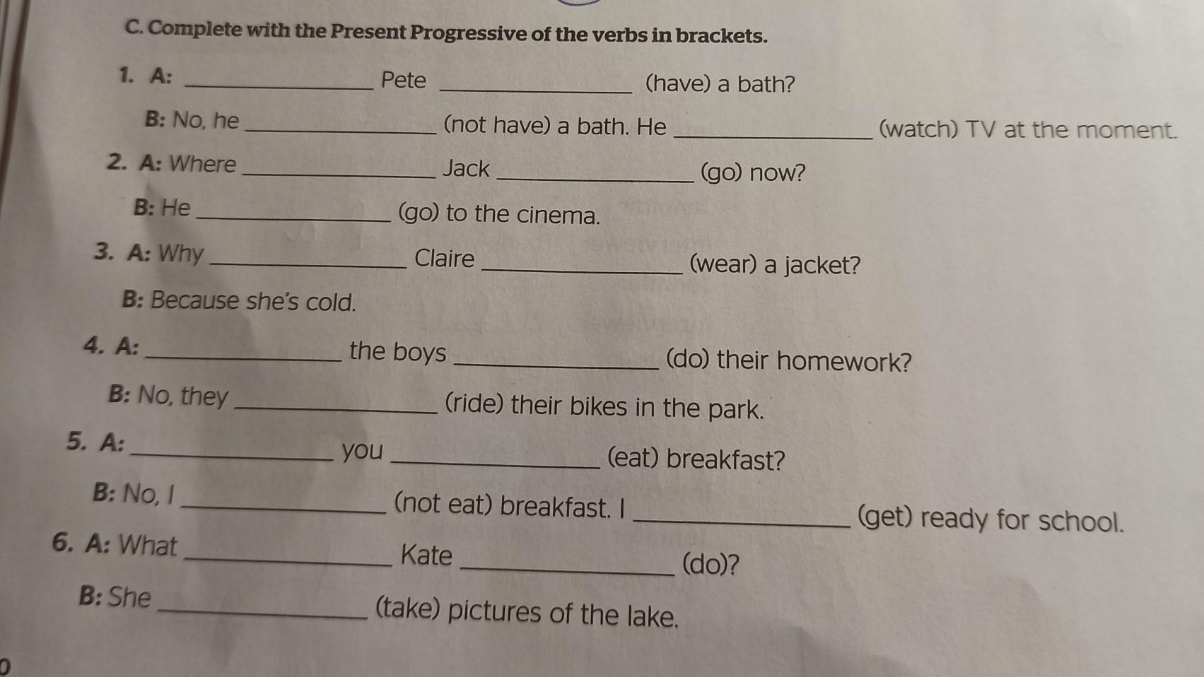 C. Complete with the Present Progressive of the verbs in brackets. 1. A: (have) a bath? B: No, he 2. A: Where B: He 3. A: Why_ B: Because she's cold. 4. A: B: No, they 5. A: B: No, I 6. A: What B: She Pete (not have) a bath. He Jack (go) to the cinema. Claire the boys you (go) now? (wear) a jacket? (not eat) breakfast. I Kate (take) pictures of the lake. (do) their homework? (ride) their bikes in the park. (eat) breakfast? (watch) TV at the moment. (do)? (get) ready for school.