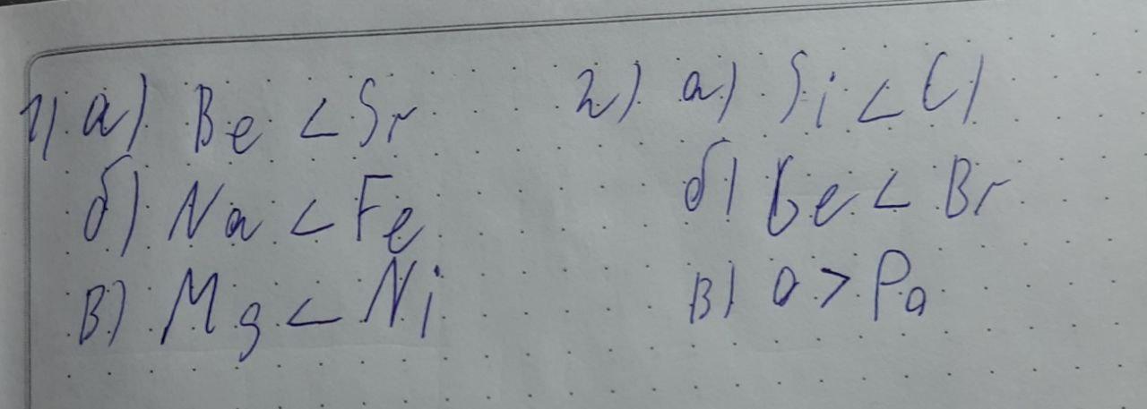 позначити знаками "більше" або "менше"): а) Ве - Sr, б) Na - Fe, в) Mg - Ni. 4. Який неметал активніший (позначити знаками "більше" або "менше"): а) Si - Cl, б) Ge - Br, в) O - Po.