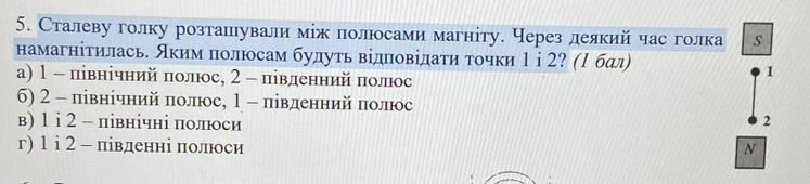 намагнітилась. Яким полюсам будуть відповідати точки 1 i 2? (1 бал)