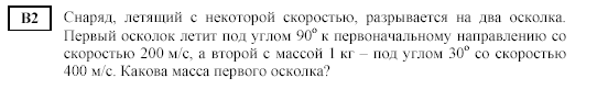 Не уверена что так. 1)Спроектируем закон сохранения импульса на направление перпендикулярное первоначальному направлению движения 0 = m₁v₁ sin(90°) - m₂v₂ sin (30°) ⇒ m₂ = m₁v₁ sin 90° /(v₂ sin(30°)) = 2m₁v₁/v₂