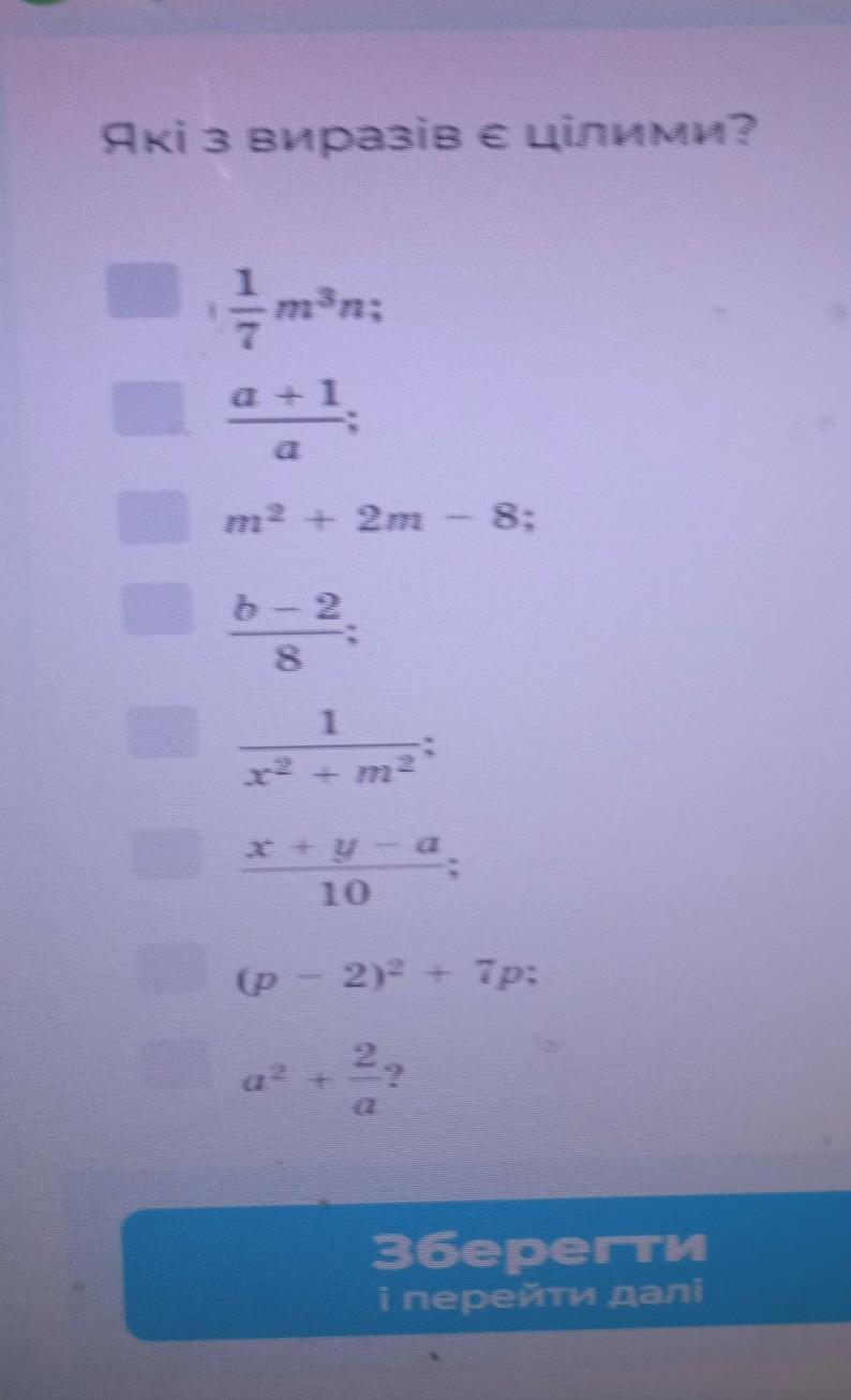 1/7m³n, m²+2m-8, b-2/8, x+y-a/10, (p-2)²+7p