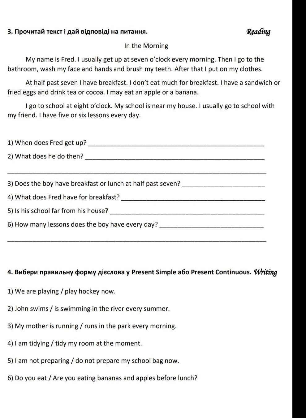 4) He doesn't eat much for breakfast, He has a sandwich or fried eggs and drink tea or cocoa. He may eat an apple or a banana