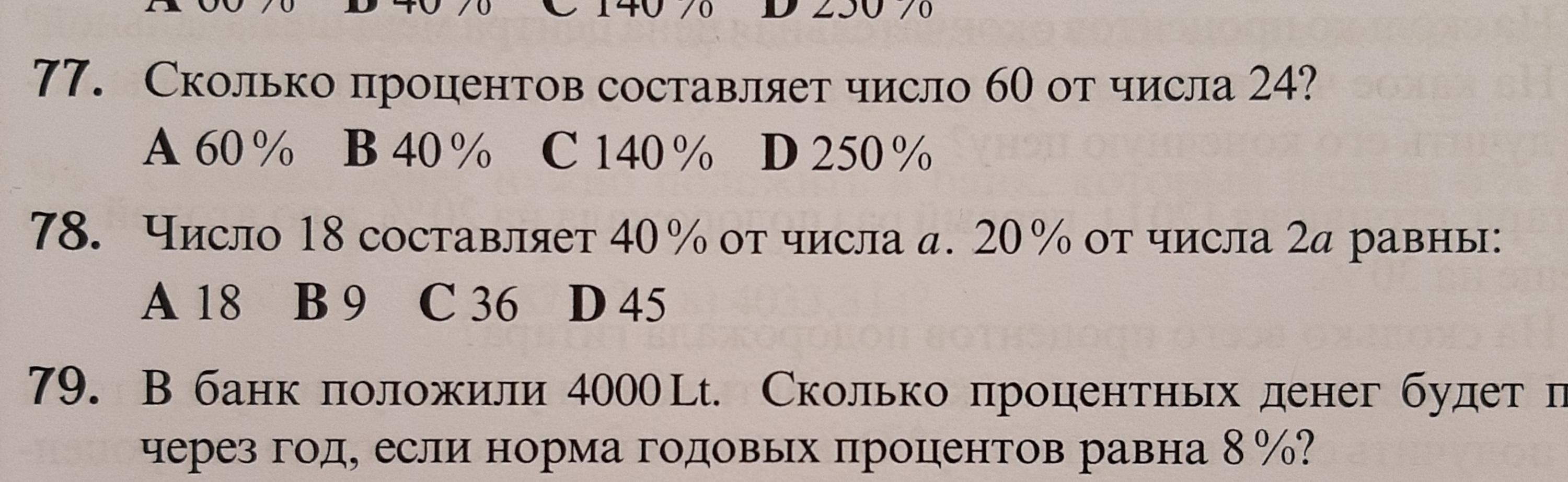 78.Число 18 составляет 40% от числа a. 20% от числа 2a равны: A 18; B 9; C 36; D 45