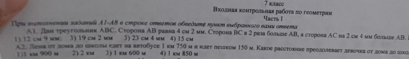 2. Лена от дома до школы едет на автобусе 1 км 750 м н ндет пешком 150 м. Какое расстояние преодолевает девочка от дома до шк 1)1 км 900 м 3) 1 км 600 м 4) 1 км 850 м 2) 2 км А3. Стороны прямоугольника равны 16 см и 4 см. Этот прямоугольник разделили на две равные части. Найти площадь каждой часть 3) 32 116 4) 20\ 2)64