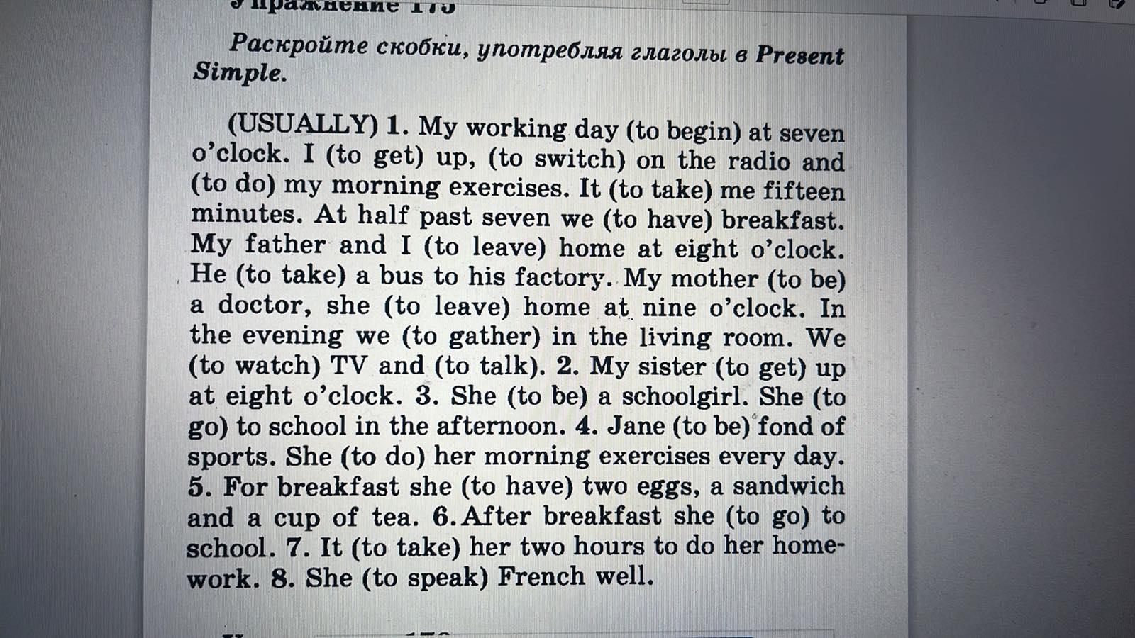 1. My working day begins at seven o'clock. I get up, switch on the radio and do my morning exercises. It takes me fifteen minutes. At half past seven we have breakfast. My father andleave home at eight o'clock. He takes a bus to his factory. My mother is a doctor, sheleaves home at nine o'clock. In the evening we gather in the living room. We watch TV and talk.