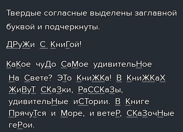Спишите текст. Подчеркните в тексте твёрдые согласные. Дружи с книгой! Какое чудо самое удивительное на свете? Это книжка! В книжках живут сказки, рассказы, удивительные истории. В книге прячутся и море, и корабли, и ветер, и сказочные герои.