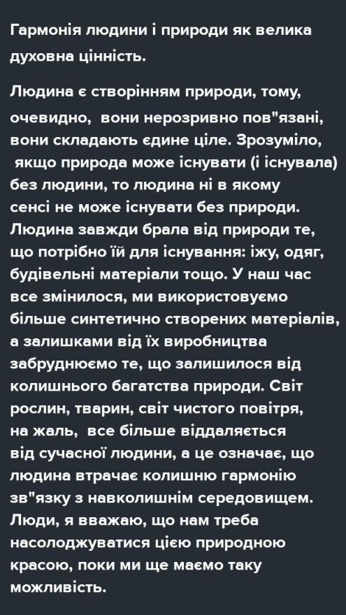 дописати твір Написання есе («Гармонія людини і природи як велика духовна цінність», «Земле барвінкова, дай мені здоров’я!») в публіцистичному стилі з використанням речень зі звертаннями та вставними слова