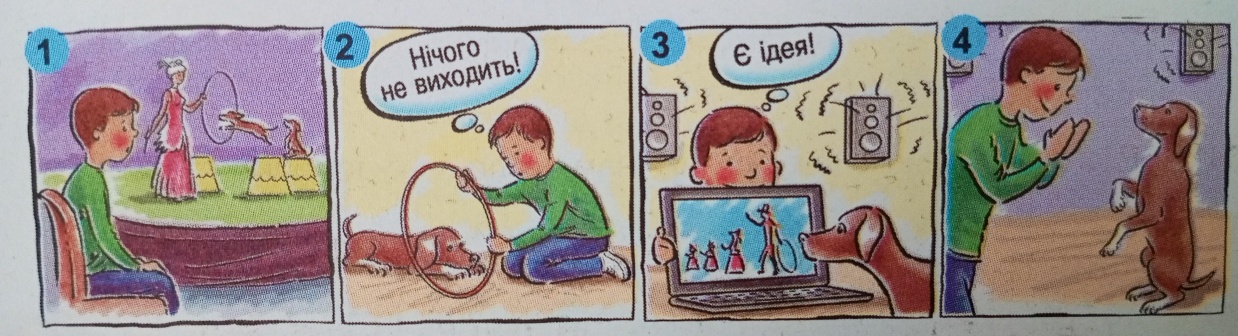 Складіть і запишіть за коміксом текст-розповідь (6-8 речень) у художньому стилі попередньо сформулюйте тему й основну думку майбутнього висловлення, обміркуйте структуру (зачин, основна частина, кінцівка), складіть план доберіть до тексту заголовок.