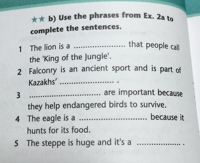 ** b) Use the phrases from Ex. 2a to complete the sentences. ..... that people call the 'King of the Jungle'. 2 Falconry is an ancient sport and is part of Kazakhs' 1 The lion is a 3 ... they help endangered birds to survive. ........ are important because 4 The eagle is a hunts for its food. 5 The steppe is huge and it's a because it