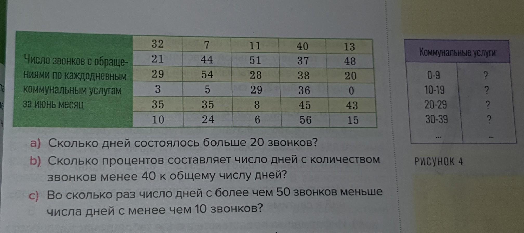 1. Коммунальная служба. Запишите в таблицу частот инфор- мацию (рисунок 4) о количестве звонков, связанных с ком мунальными услугами в городе А в июне месяце. Число звонков разбейте на интервалы по 10 в каждом. Исследуйте таблицу числа ежедневных звонков и ответьте на следую- щие вопросы: