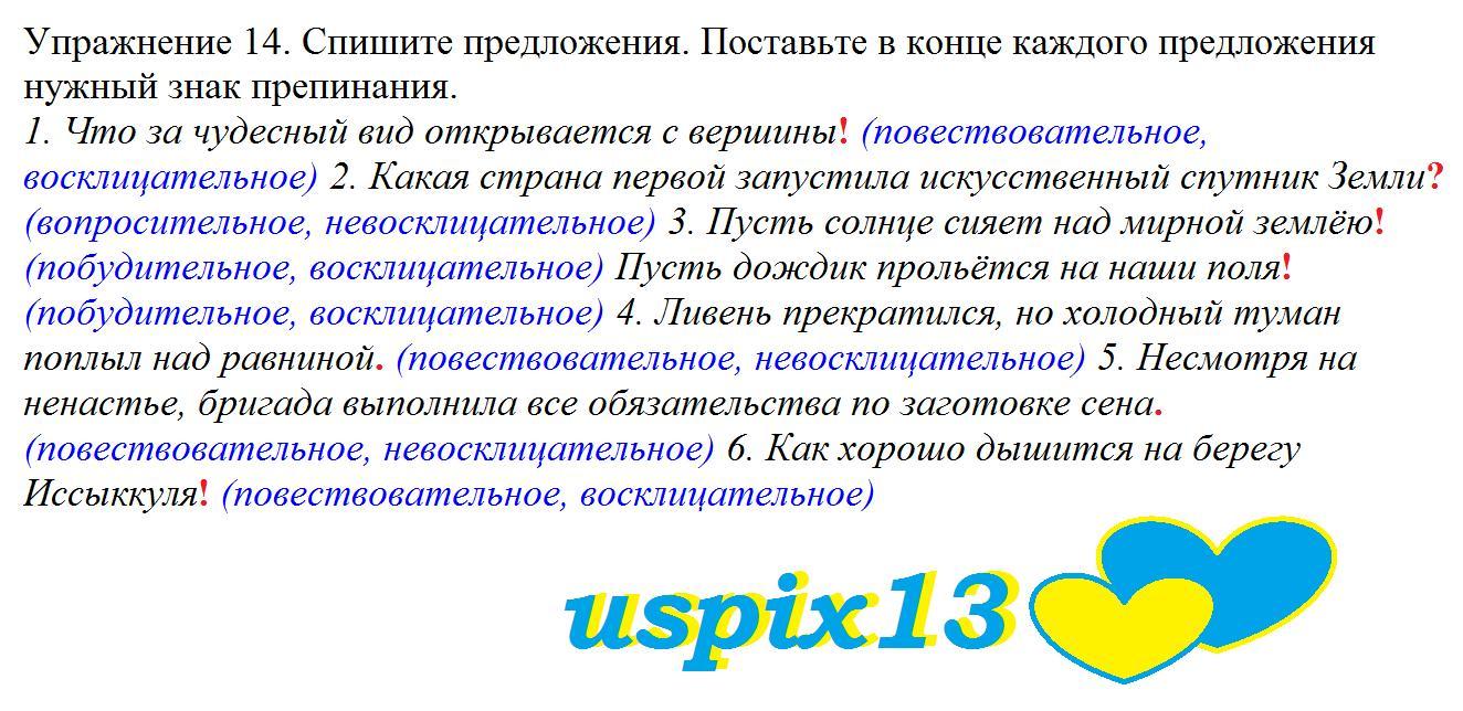 Упражнение 14. Спишите предложения. Поставьте в конце каждого предложения нужный знак препинания. 1. Что за чудесный вид открывается с вершины 2. Какая страна первой запустила искусственный спутник Земли 3. Пусть солнце сияет над мирной землёю Пусть дождик прольётся на наши поля 4. Ливень прекратился, но холод- ный туман поплыл над равниной 5. Несмотря на ненастье, бригада выполнила все обязательства по заготовке сена 6. Как хорошо дышится на берегу Иссыккуля