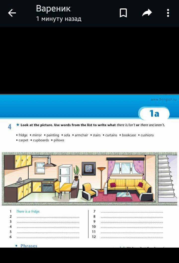 123456 1a ★ Look at the picture. Use words from the list to write what there is/isn't or there are/aren't. fridge mirror painting sofa armchair stairs curtains bookcase cushions carpet cupboards • pillows 1 There is a fridge. 7 8 9 10 11 12.