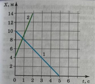 На рисунке изображены графики зависимости координат двух тел от времени. Напишите их уравнения движения (уравнения координаты). Определите аналитически время и место встречи, сравните с координатами точки встречи на графике.