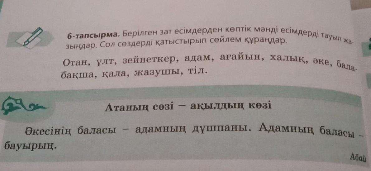 6-тапсырма. Берiлген зат есімдерден көптiк мәнді есімдерді тауып жа- зындар. Сол сөздерді қатыстырып сөйлем құраңдар. ( 5 предложений)
