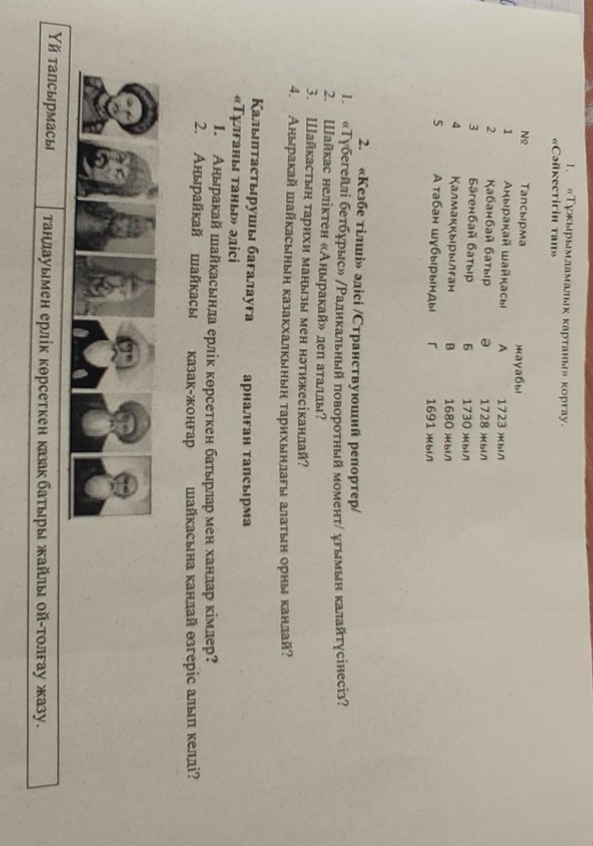 1. «Тұжырымдамалык картаны» коргау. «Сәйкестігін тап» No 1 2 3 4 5 Тапсырма Акырақай шайқасы Қабанбай батыр Бäгенбай батыр Қалмаққырылған А табан шұбырынды жауабы A Ә 6 В Г 1723 жыл 1728 жыл 1730 жыл 1680 жыл 1691 жыл