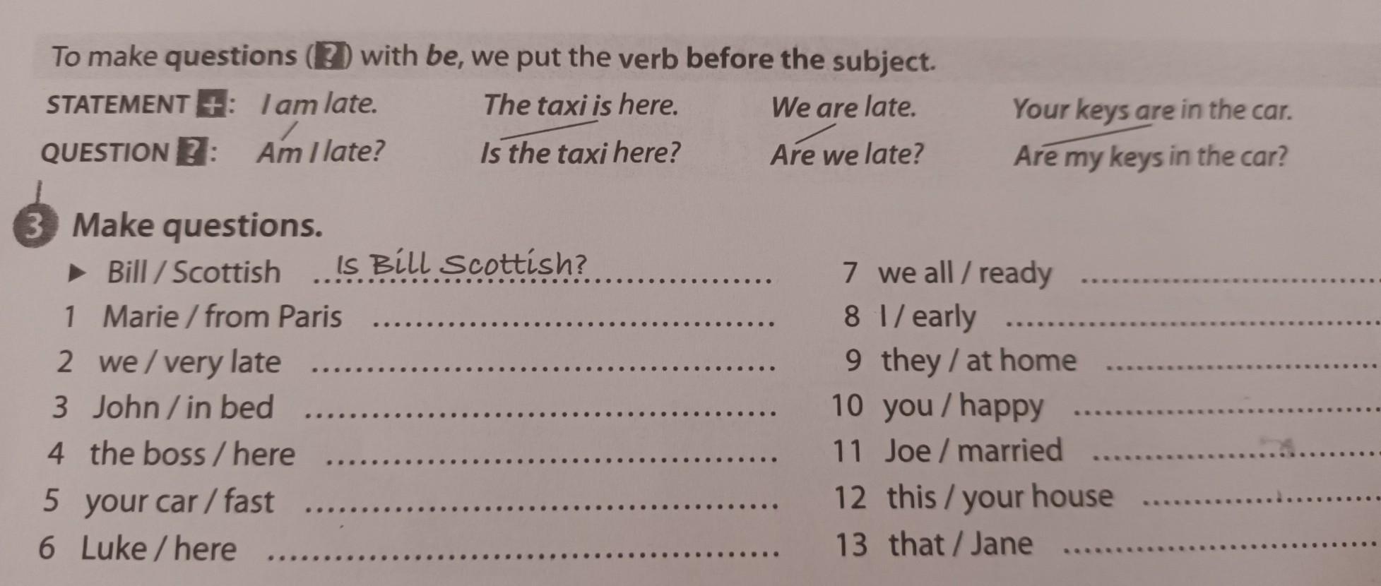 3 Make questions. ► Bill/Scottish 1 Marie/from Paris 2 we/very late 3 John/in bed 4 the boss/here 5 your car/fast 6 Luke/here Is Bill Soottish? 7 we all/ready 8 1/early 9 they / at home 10 you/happy .... 11 Joe/married 12 this/your house 13 that/Jane