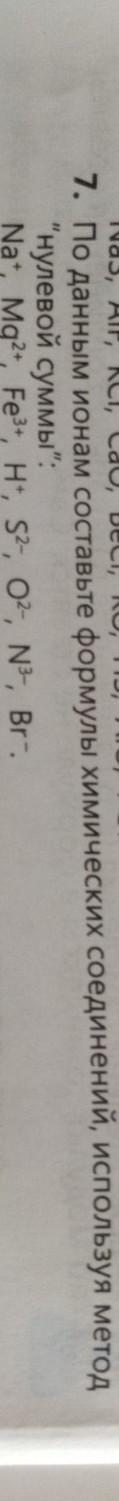 7. По данным ионам составьте формулы химических соединений, используя метод "нулевой суммы": Na+, Mg2+, Fe3+, H+, S2-, O2-, N3-, Br-.