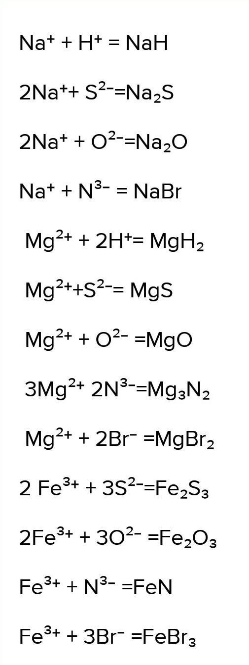 По данным ионам составьте формулы химических соединений, используя метод "нулевой суммы": Na+, Mg2+, Fe3+, H+, S2-, O2-, N3-, Br-.