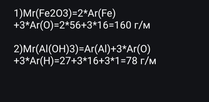 2)Mr(Аl(ОН)3)=Ar(Al)+3*Ar(O)+3*Ar(H)=27+3*16+3*1=78 г/м