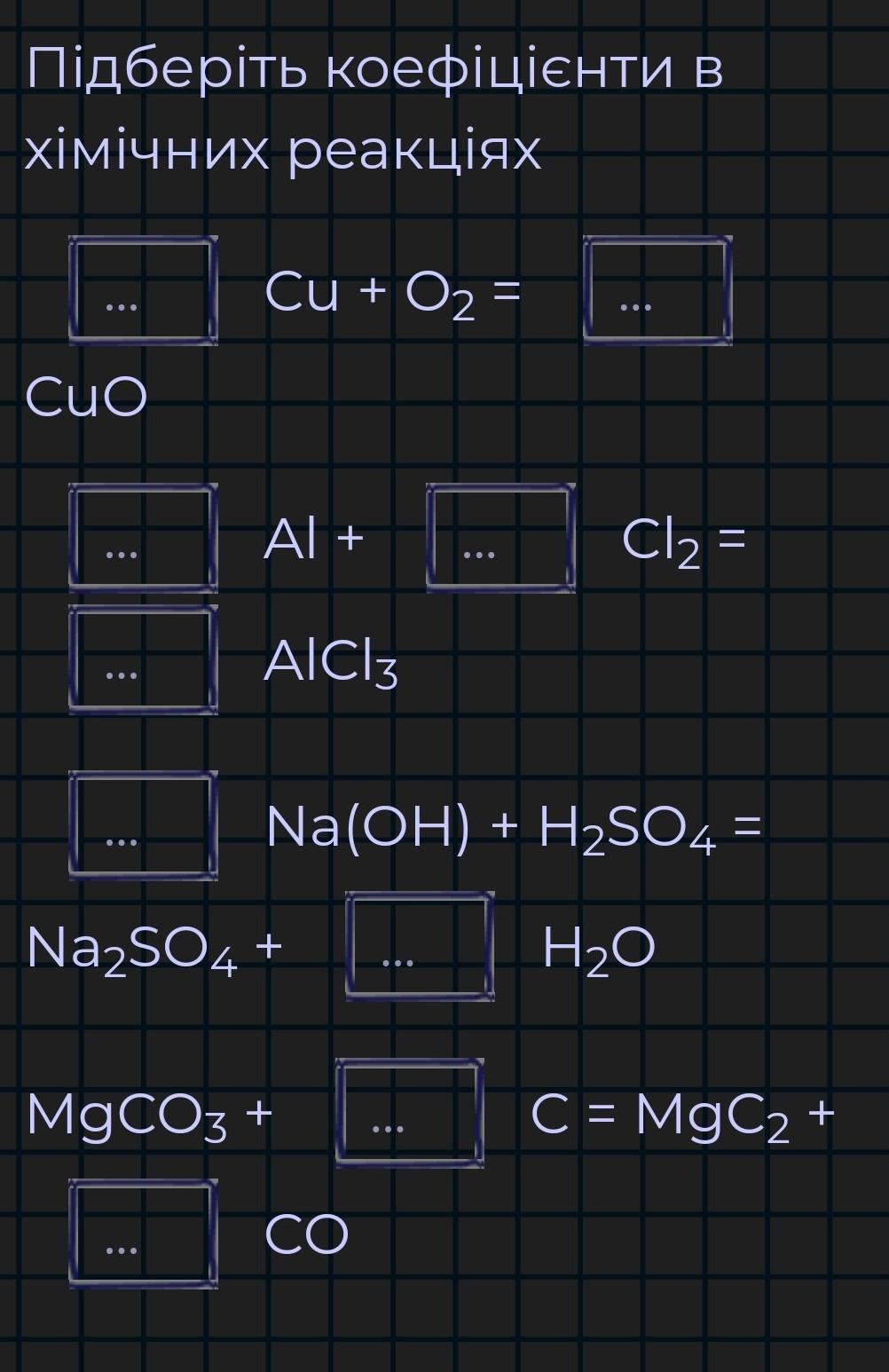 СРОЧНО ПОМОГИТЕ ДАМ 40 БАЛОВ!!!!Підберіть коефіцієнти в хімічних реакціях: