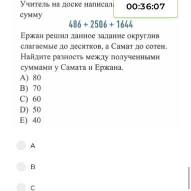486 + 2506 + 1644 = 4636Если данное число округлить до десятков, то получим : 4640Если данное число округлить до сотен, то получим : 46004640 - 4600 = 40Ответ : Е) 40