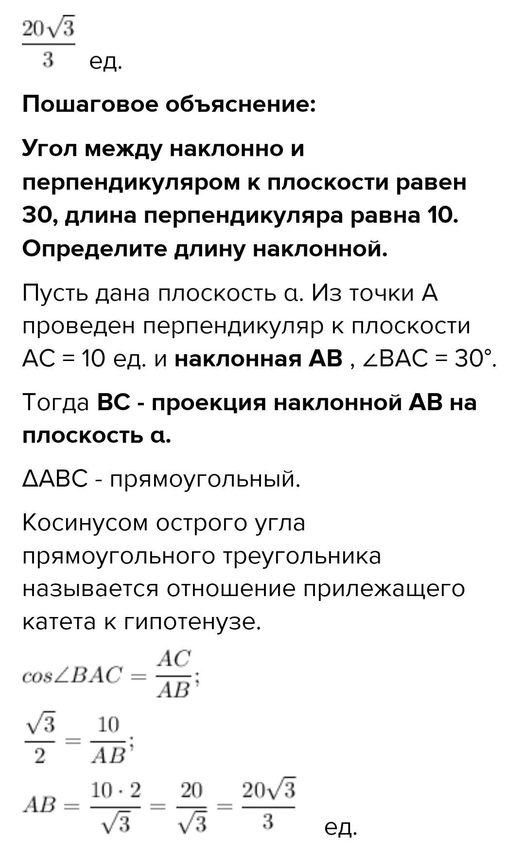 Длина наклонной равна 12 см, а угол между наклонной и перпендикуляром равен 30 градусов. Найдите длину проекции и перпендикуляра. (нужно использовать определение синуса и косинуса для прямоугольного треугольника или свойства угла 30 градусов).