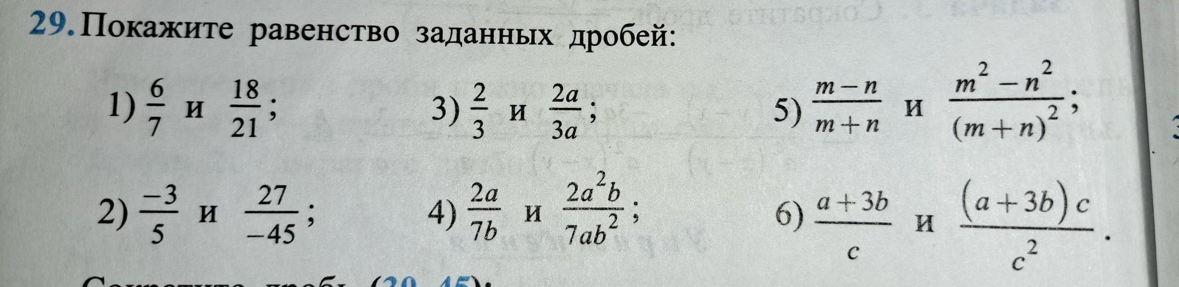 29.Покажите равенство заданных дробей: 1) 6/7 и 18/21; 2) -3/5 и 27/-45; 3) 2/3 и 2а/3а; 4) 2а/7b и 2а²b/7ab² 5) m-n/m+n и m²-n²/(m+n)²; 6)a+3b/c и(a+3b)c/c²