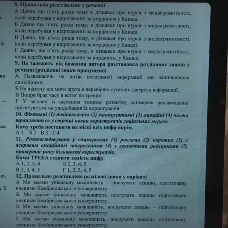 8. Правильно розставлено у реченні В. Кома ставиться перед єднальним союзом "коли", щоб уникнути двозначності. У варіанті А може виникнути уявлення, що дізнався про курси і перебував у відрядженні в один і той же час, а в варіанті Г - що курси з медіаграмотності були в Канаді.