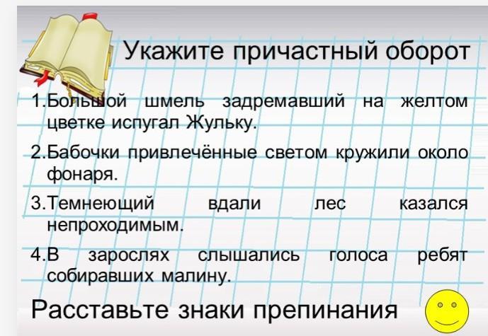 Объяснение: причастные обороты выделены запятыми. в 3 предложении нет запятой, так как главное слово стоит ПОСЛЕ причастного оборота "темнеющий вдали"
