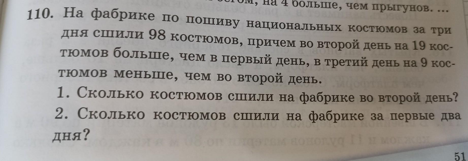 . 110. На фабрике по пошиву национальных костюмов за три дня сшили 98 костюмов, причем во второй день на 19 кос- ТЮМОВ больше, чем в первый день, в третий день на 9 кос- тюмов меньше, чем во второй день. 1. Сколько костюмов сшили на фабрике во второй день? 2. Сколько костюмов сшили на фабрике за первые два дня?С условием и решением пожалуйста
