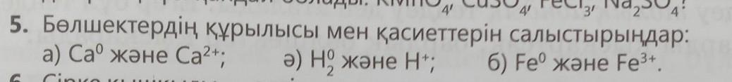 5. Бөлшектердің құрылысы мен қасиеттерін салыстырыңдар: a) Caº және Ca2+; ә) Н және Н+; 6) Feº және Fe3+.