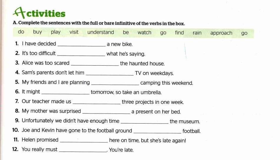 Activities A. Complete the sentences with the full or bare infinitive of the verbs in the box. do buy play visit understand be watch go find 1. I have decided 2. It's too difficult 3. Alice was too scared 4. Sam's parents don't let him 5. My friends and I are planning 6. It might. 7. Our teacher made us a new bike. what he's saying. the haunted house. TV on weekdays. tomorrow, so take an umbrella. 8. My mother was surprised. 9. Unfortunately we didn't have enough time. 10. Joe and Kevin have gone to the football ground 11. Helen promised 12. You really must camping this weekend. three projects in one week. a present on her bed. rain the museum. football. here on time, but she's late again! You're late. approach go