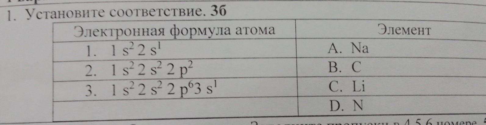 1. Установите соответствие Электронная формула атома 1. 1 s22s1 2. 1 s2 s² 2 p² 2 3. 1 s2 s² 2 pº3 s¹ A. Na B. C C. Li D. N Элемент 36 33,80 9)