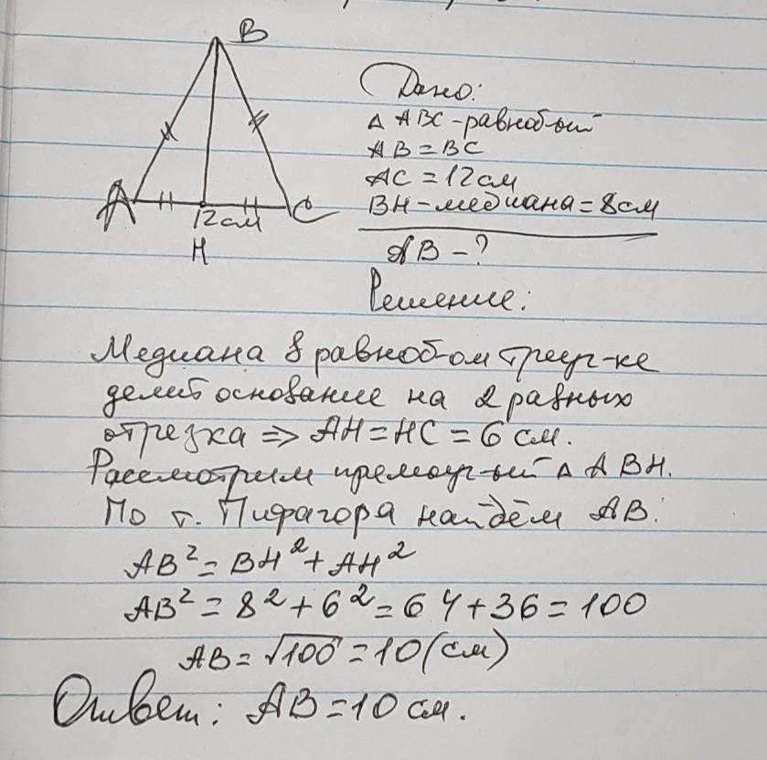 основа рівнобедреного трикутника дорівнює 12 см, а медіана проведена до неї 8см.Чому дорівнює довжина бічної строни