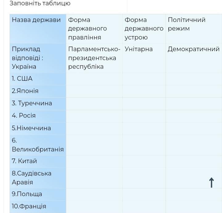 7) республіка, унітарна, демократичний(авторитарна держава)