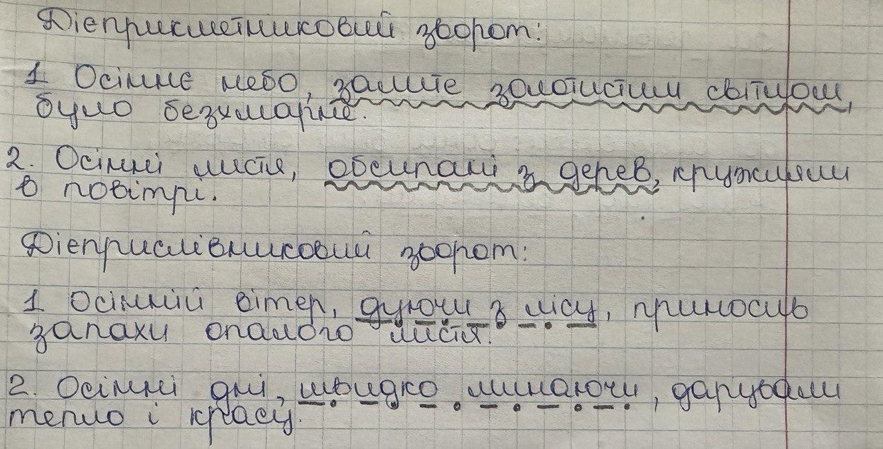 Скласти по 2 речення з дієприкметниковим та дієприслівниковим зворотом(тема речень - осінь; звороти підкреслити відповідно до синтаксичної ролі).