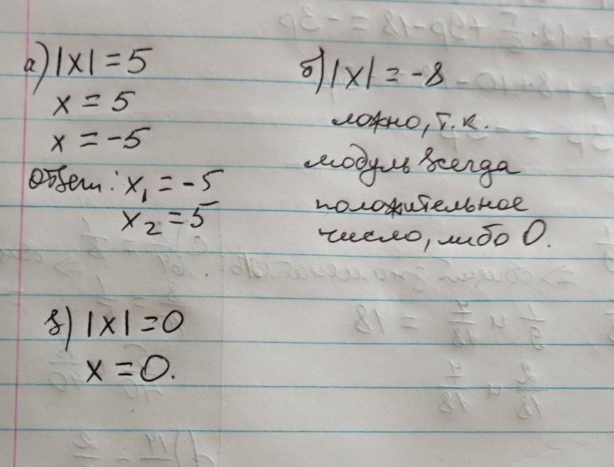 5. Розв'яжи рівняння: a) |x|=5; 6) |x| =-8; в) |x|=0. помогите пж, если не сложно распишите а ответе..